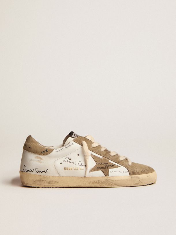 Super Star Sneakers In White Leather With Dove Gray Suede Inserts And All Over Black Lettering Golden Goose